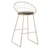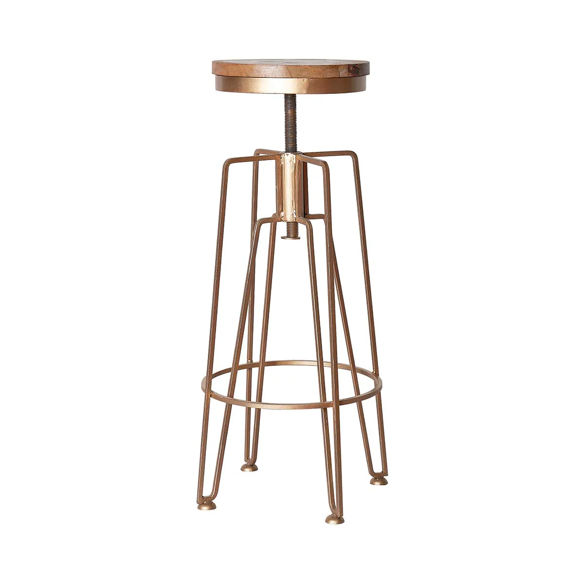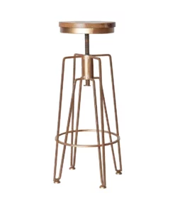 Taburete de bar de estilo vintage, fabricado con estructura de acero color dorado y asiento redondo de madera natural. Taburete con usillo para su regulación de altura.