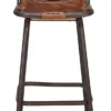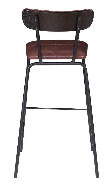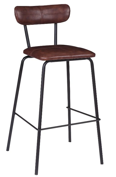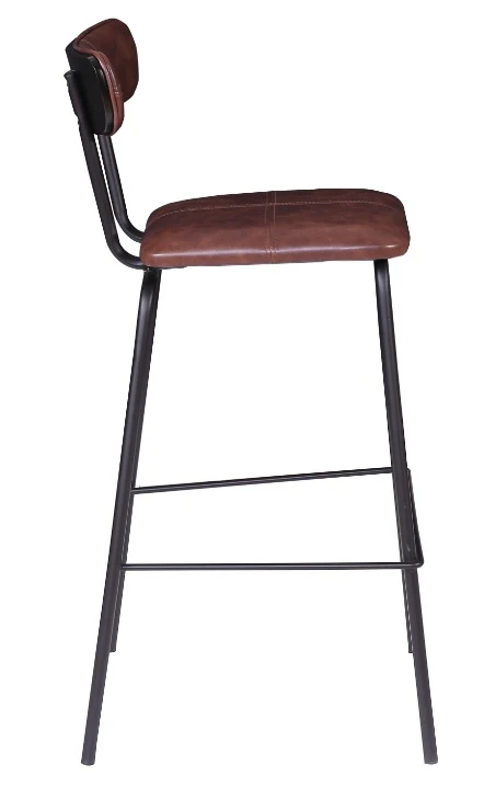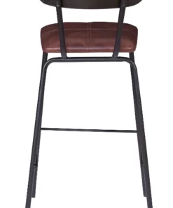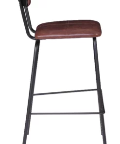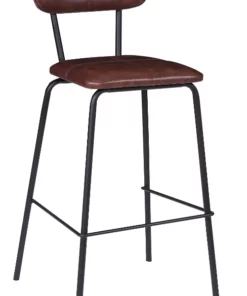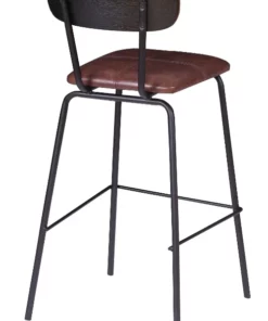 Taburete de bar de estilo vintage, fabricado con estructura de acero negro y asiento y respaldo tapizado en piel sintética color marrón envejecido y respaldo con trasera de madera y tapizado igual que el respaldo.